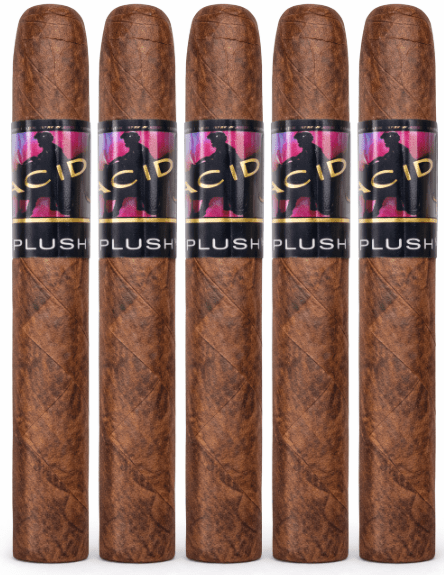 Acid Plush 5-Pack is a bold, aromatic addition to Drew Estate’s iconic ACID lineup, crafted in Nicaragua and known for its deeper, more refined infusion profile. Wrapped in a dark Connecticut Broadleaf Maduro over premium Nicaraguan binder and fillers, this robusto-extra format (5 ½ x 50) delivers a rich, slow-burning experience with a smooth draw. Unlike some sweeter ACID blends, Plush leans into a more balanced, medium-bodied profile, offering layers of dark cocoa, espresso, and subtle berry sweetness, accented by floral undertones and a lingering, aromatic finish that evolves throughout the smoke.