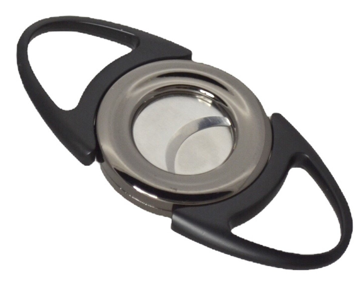 Elevate your cigar cutting game with our sleek and stylish cutter that stands out from the rest! Crafted from black metal and stainless steel, this double guillotine cutter can easily handle cigars up to 56 ring gauge. Its approximate dimensions are 3.75 in. x 2.7 in. x .25 in. and it weighs .5 lbs. Go ahead and make a statement with this unique accessory for your cigars.