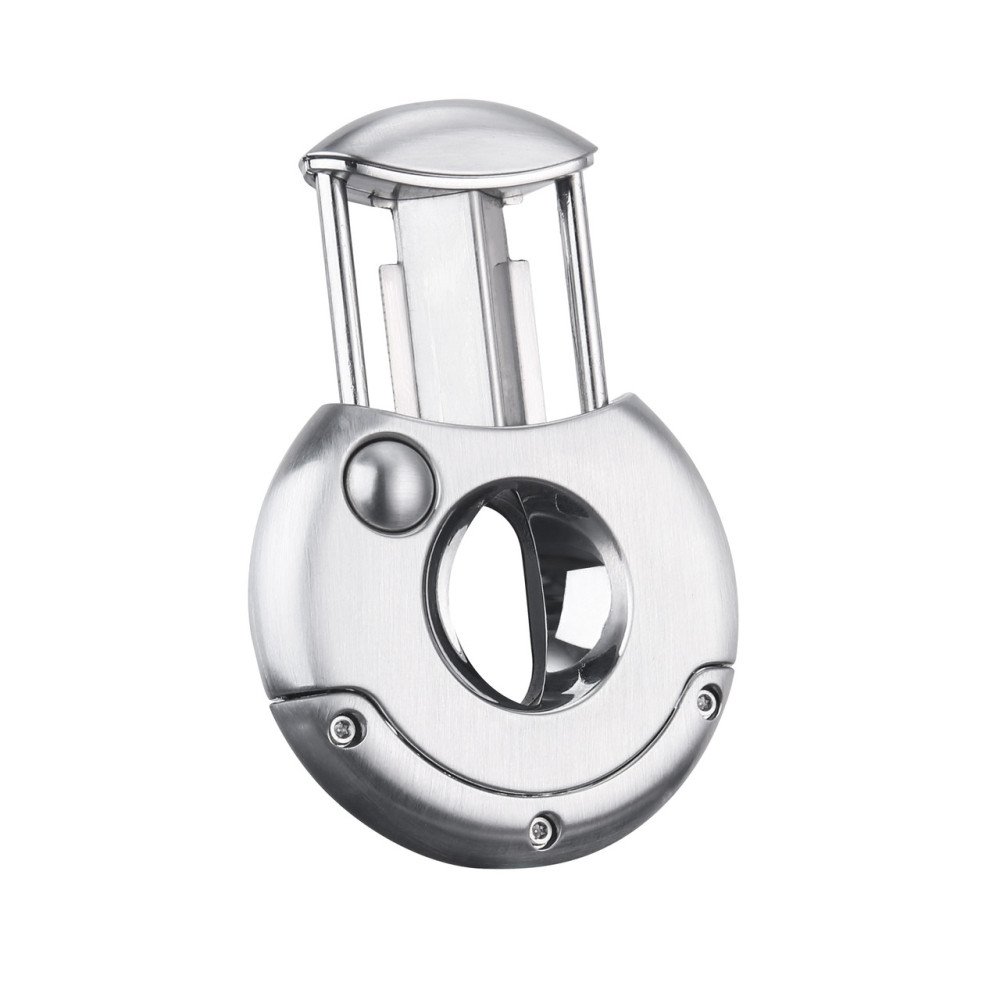 Introducing the Wedge Cutter - a sleek and sturdy tool designed for effortless cutting. With its deep V cut and solid metal body, it can effortlessly slice through cigars up to 60 ring gauge. Simply press the push-button mechanism and enjoy a perfect cut every time. Measuring at 2.4" x 2.4" x 0.6", this compact cutter weighs in at just 3.3 oz for convenient portability.