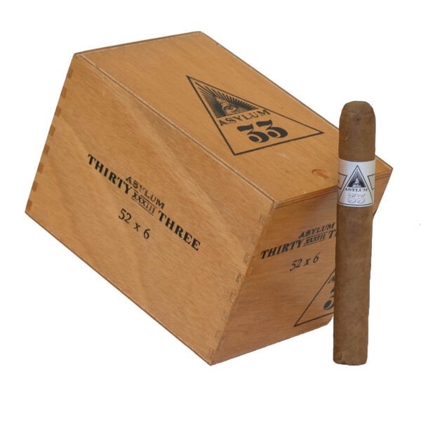 The Asylum 33 6x52 is a bold, full-bodied cigar crafted for smokers who appreciate deep flavor and old-world strength. Hand-rolled in Honduras, this hefty toro delivers a rich, earthy profile built around a dark, oily wrapper that sets the tone from the first draw. Notes of black pepper, espresso, and aged tobacco unfold smoothly as the cigar burns, offering a robust yet balanced experience that stays consistent from start to finish. It’s a great choice for seasoned smokers looking for a cigar with character, strength, and a satisfying finish.