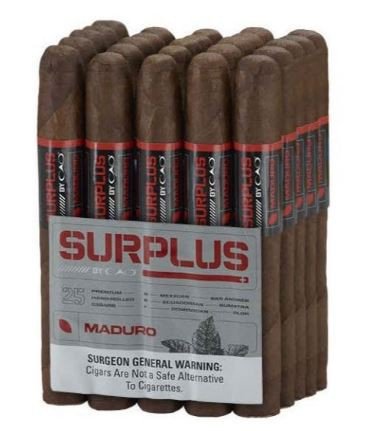 The CAO Surplus Maduro Toro is a bold yet approachable everyday cigar that delivers rich maduro flavor without the premium price tag. Measuring a balanced 6 x 50, this Toro showcases a dark Mexican San Andrés Maduro wrapper over an Ecuadorian Sumatra binder and Dominican Olor long-fillers. The result is a medium-to-full bodied smoke layered with notes of cocoa, espresso, earth, and a touch of peppery spice. Crafted for consistency and smooth performance, the Surplus Maduro Toro offers dependable construction, an even burn, and satisfying flavor that makes it an easy choice for stocking your humidor.