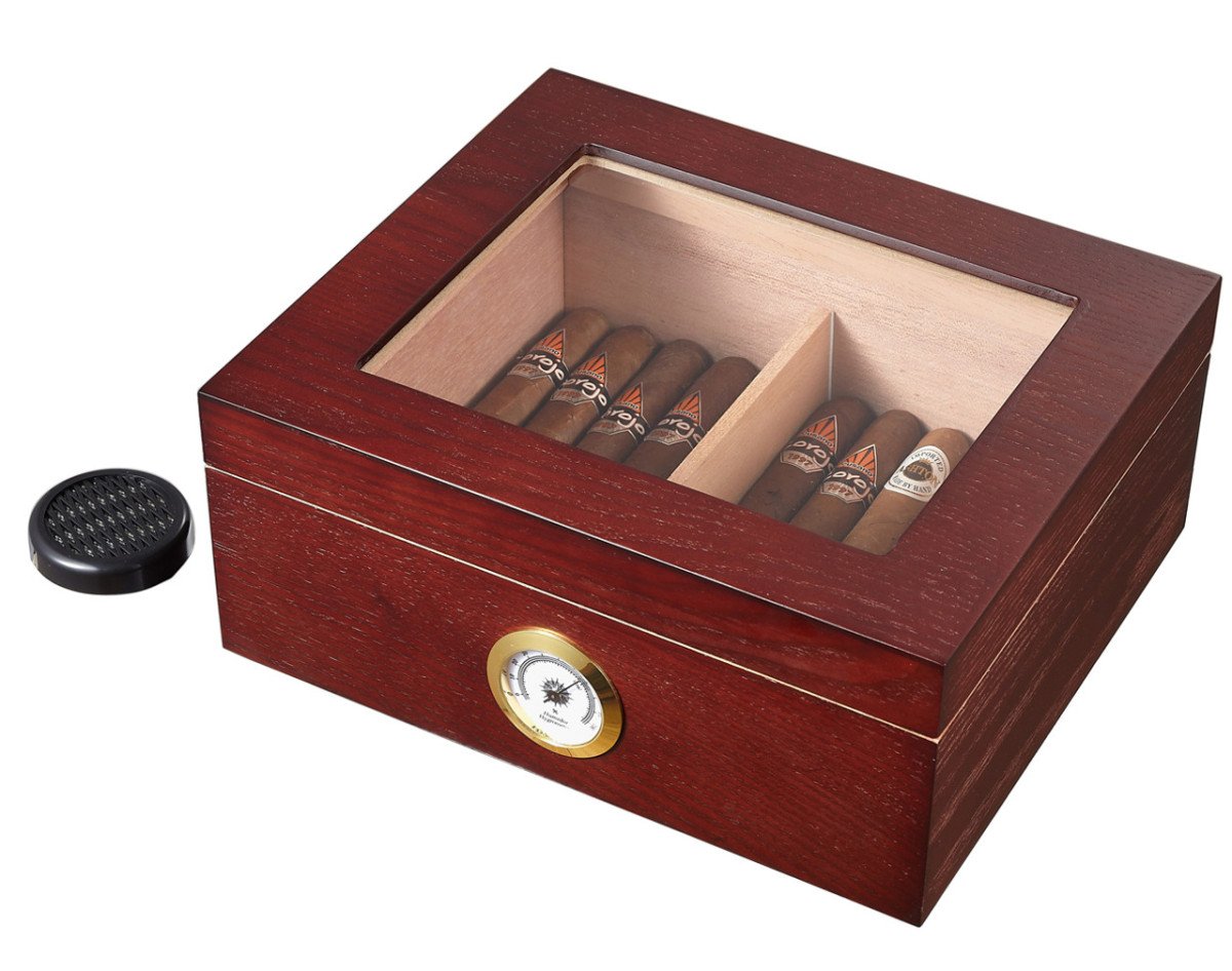 This product is crafted with cedar veneer and features a glass top, gold hinges, and an airtight enclosure for maintaining cigar humidity. It also includes a built-in analog hygrometer, section divider, and felt bottom to protect surfaces. The included humidifier attaches to the humidor for convenience. With dimensions of 8.7 inches by 10.18 inches by 4 inches and weighing only 11 pounds, it is perfect for both office and home use. The product comes packaged in a white cardboard box, making it easy to gift wrap, and includes instructions for initial use and upkeep.