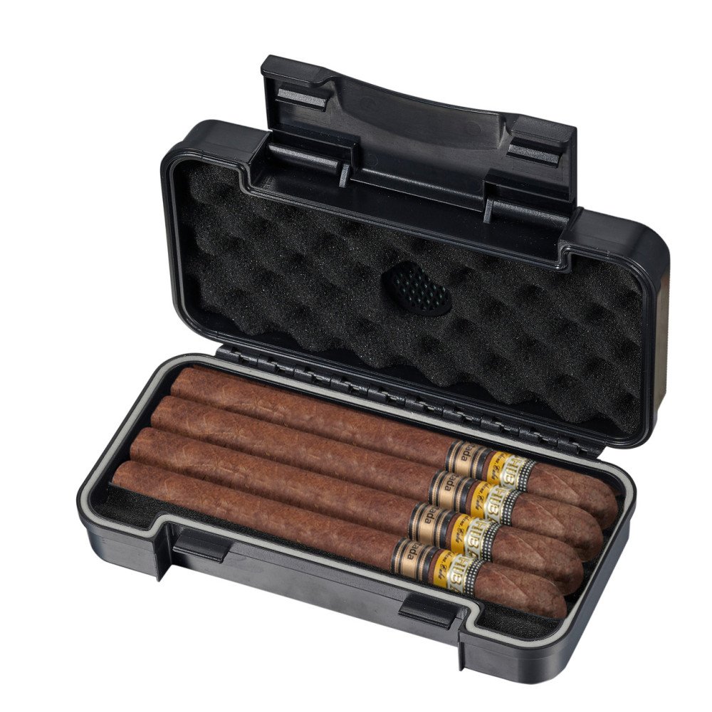 Travel with peace of mind knowing your cigars are secure and guarded in the Rongai travel humidor. The foam interior keeps your cigars comfortably packed together, protecting them from any bumps along the way. Its snapping lid provides a tight enclosure, ensuring your cigars stay in place. This black travel humidor has a metal engraving plate and can hold up to 4 cigars with a 70 ring gauge. Measuring at 9.5 inches by 4 inches by 2 inches and weighing only 1 pound, it's the perfect companion for your travels.