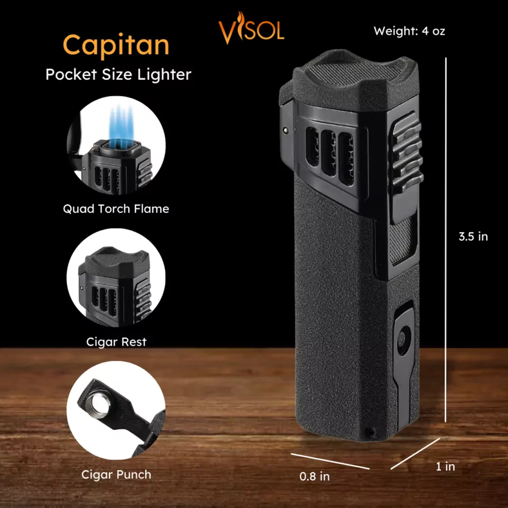 With a variety of features, this lighter ensures an effortless lighting experience for your cigar. Its elegant design produces a strong quad flame with a simple flip and press of the lever on its side. The lid also acts as a built-in rest for your cigar when needed. Additional functions include a cigar punch and butane fuel window to monitor levels. This lighter takes care of everything, providing the ultimate smoking experience. Approximate dimensions are 3.5 in x 1 in x .8 in, weighing only .3lbs. It features a quad flame torch and double action ignition, while ships empty of butane due to shipping regulations.