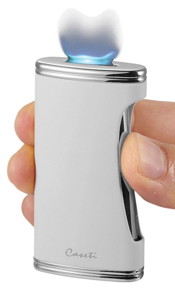 This cigar lighter boasts a sleek body with a contemporary design, setting it apart from ordinary lighters. Its topless and switchless design adds an air of mystery, but igniting the flat flame is as simple as pushing on the chrome side. Plus, keeping track of your butane levels is effortless with the convenient fuel window located at the bottom on the opposite side. The lighter also features a built-in cigar punch and flame adjustment toggle on its base. Measuring approximately 3 in. x 1.6 in. x 0.7 in., and weighing 3.2 oz., this lighter comes in a white finish with chrome accents. Please note that this product does not come filled with butane due to shipping regulations.