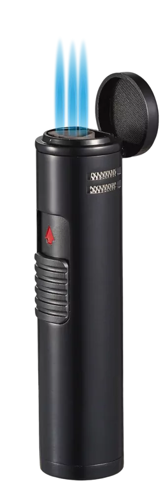Introducing the Triple Flame Torch, coming in at approximately 4.2 x 1.1 x 1.1 inches and a weight of 4.1 oz. It also features a built-in cigar punch and a convenient butane level window. Please note that this product will be shipped without butane due to shipping regulations.