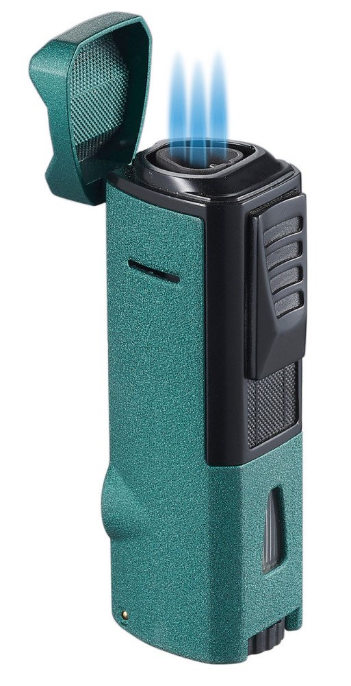 This versatile lighter is perfect for all occasions and can easily adapt to any situation. It would make a valuable addition to your desk or travel gear. Once you flip the lid and pull down the lever on the side, a double action ignition will ignite a powerful triple flame. The lid also features a built-in cigar rest for convenience. Additionally, there is a built-in cigar punch and butane fuel window on the sides for easy use and monitoring of butane levels. With approximate dimensions of 3.5 in x 1.25 in x .8 in and weight of .3lbs, this lighter is both compact and functional. Please note that it will ship empty of butane due to shipping regulations.