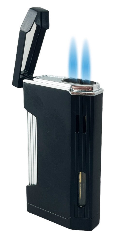 This sleekly designed lighter bears a striking resemblance to its namesake, with a unique shape and metal construction. The lid can be flipped open and the lever on the side pressed for dual action ignition, resulting in two torch flames. To ensure you never run out of butane, there is a fuel window conveniently located on the other side. Measuring approximately 2.75 x 1.5 x .65 inches and weighing only .25 lbs, this dual flame torch lighter is a compact and lightweight option. Please note, it will ship without butane due to shipping regulations.
