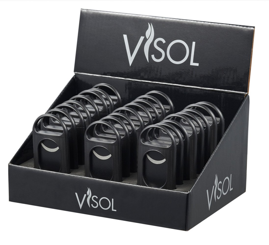 Complete your Cigar Shop Countertop display with the latest twenty-four pack of cigar cutters from Visol. This prepack features an extra large plastic cigar cutter designed for larger cigars, effortlessly sliding into the wide opening and providing a clean cut for your favorite smoke. The black blades allow for bold engraving to truly stand out. Made with a plastic body and black stainless steel blades, this cutter can handle up to a 58 ring gauge cigar. With dimensions of 3.8" in height and 1.6" in width, it conveniently fits in your hand or pocket.