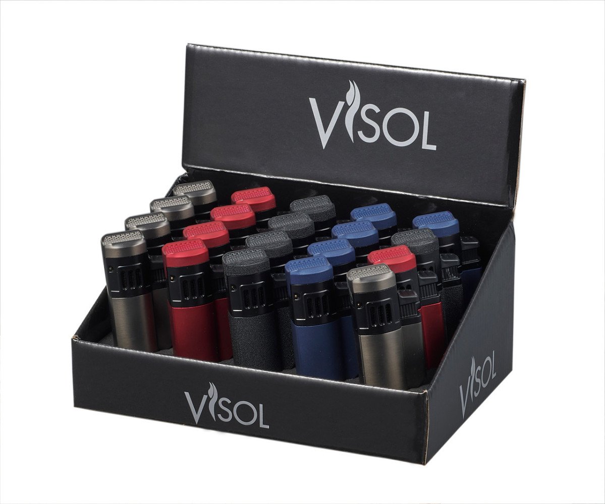 This collection includes 20 Contempo Cigar Lighters; 5 in Red, Blue, Gunmetal, and Black Crackle finishes each. All feature a quad torch flame and dual action ignition. There's also a butane fuel window, cigar punch, and rest on each one. They measure approximately 3.25 x 1 x .75 inches and come in a black cardboard display with the Visol brand. Please note that due to shipping regulations, the lighters will be shipped without butane.