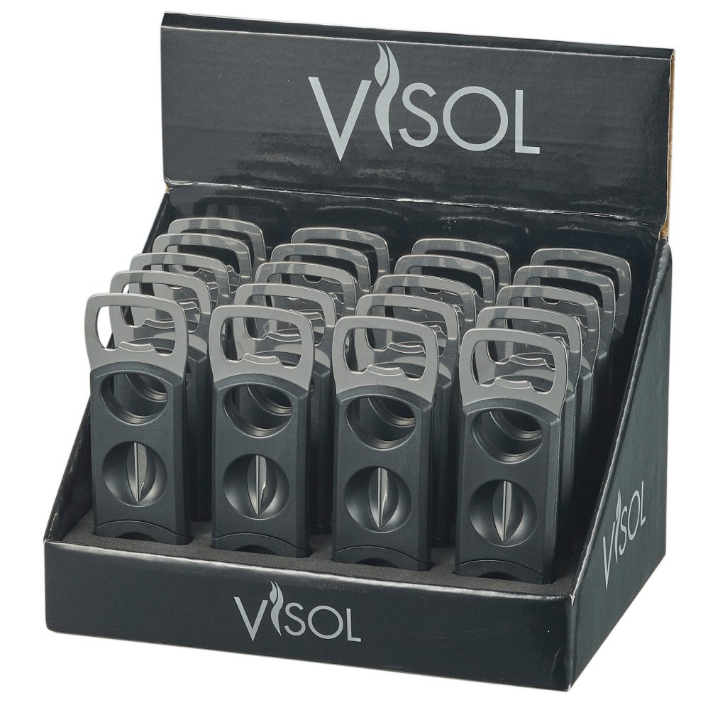 Introducing the 20 Dublin Cigar Cutters, featuring a Wedge Cut design that also functions as a Bottle Opener and Cigar Rest. Designed to accommodate up to 54 Ring Gauge cigars, these sleek black cutters are presented in a branded display made of sturdy cardboard.