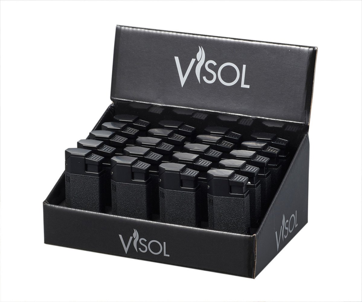 Introducing Evans Cigar Lighters - equipped with a sleek black crackle finish and a powerful triple torch flame ignited effortlessly with single action. Keep track of your butane levels with the convenient fuel window and always be prepared with the included cigar punch attachment. The compact dimensions of approximately 3 in x 2.5 in x .5 in make it perfect for on-the-go use. Don't forget to check out the stylish black cardboard Visol Branded display, though please note that these lighters will be shipped empty of butane as per shipping regulations.