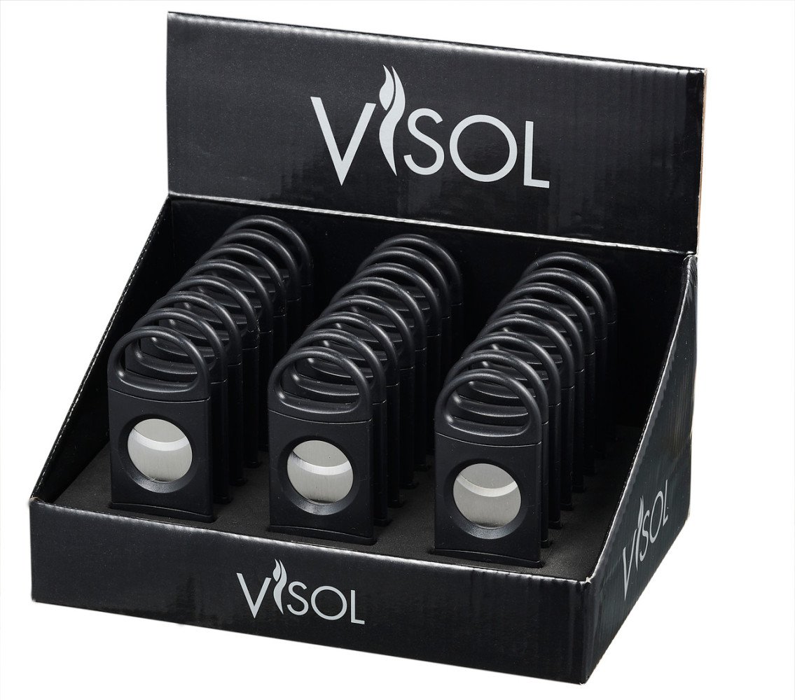 Introducing the 24 Rand Jr Cigar Cutters - a sleek and functional addition to any cigar lover's collection. Each cutter features a double guillotine design and includes a convenient cigar rest, perfect for enjoying your favorite cigars. With a generous 60 ring gauge, these cutters can handle even the thickest cigars. The elegant black cardboard display is proudly branded with the Visol name.