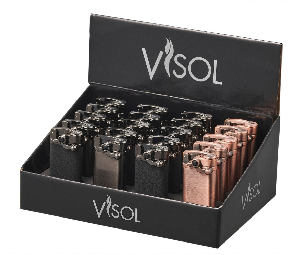 Presenting the Gunther Retail Package from Visol – a complete set of 20 Triple Flame lighters in 3 sleek color options. The branded Visol display box keeps them neatly organized. Each lighter is valued at $25 and features a single flame, adjustable flame height, easy one-step ignition, and a built-in cigar punch. Please note that due to shipping regulations, the lighters will be shipped empty of butane.