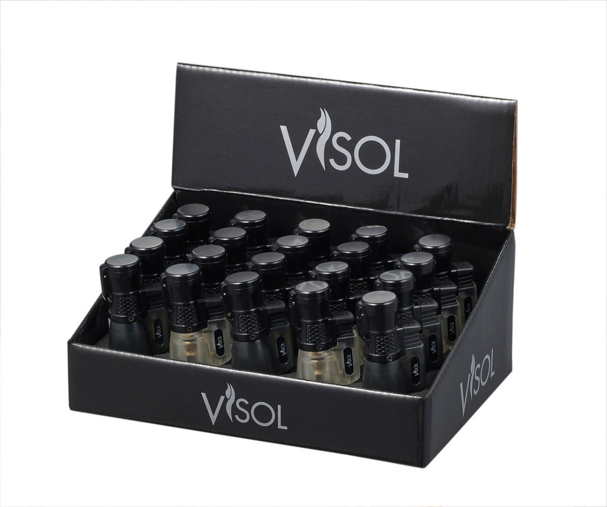 Introducing our new offering: 20 compact cigar lighters. This set includes 10 pieces in a sleek charcoal black finish and another 10 with a clear coat, each featuring triple torch flame and dual action ignition. You can easily monitor the butane fuel level through the window. Size-wise, they measure approximately 2 inches by 1 inch by 1 inch. And for presentation, they come packaged in a branded black cardboard display from Visol. Please note that these lighters will be shipped without any butane inside, as per shipping regulations.