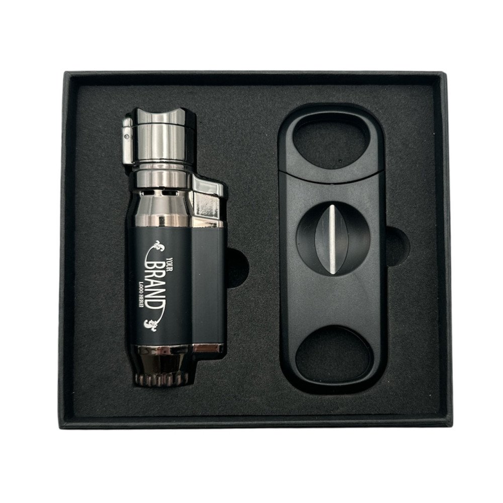 Introducing our exclusive gift set featuring the Dublin 2 Wedge Cigar Cutter and Bulldog Triple Flame Cigar Lighter, both in sleek black. Elevate this gift to a whole new level by customizing the Bulldog with a personal engraving - perfect for yourself or as a special holiday surprise for someone else. The set is beautifully presented in a matte black square box, complete with the Dublin 2 cutter and matching Bulldog lighter. Boasting dimensions of 3.75" x 1.4" x 1.0" and weighing just .25 lbs, this impressive lighter (code: VLR406009) will quickly become your go-to for lighting up your favorite cigars. The Dublin 2 Wedge Cigar Cutter, also in matte black stainless steel, is designed to cut up to 60 ring gauge cigars with precision and style - measuring at a height of 4 inches and width of 1.5 inches.